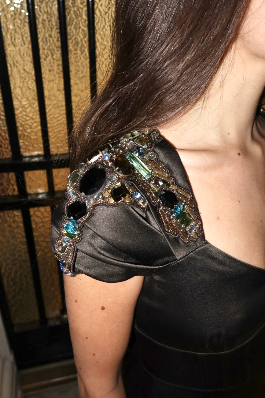 Karen Miller dress in black satin with stone cuts on the shoulders. Size: S